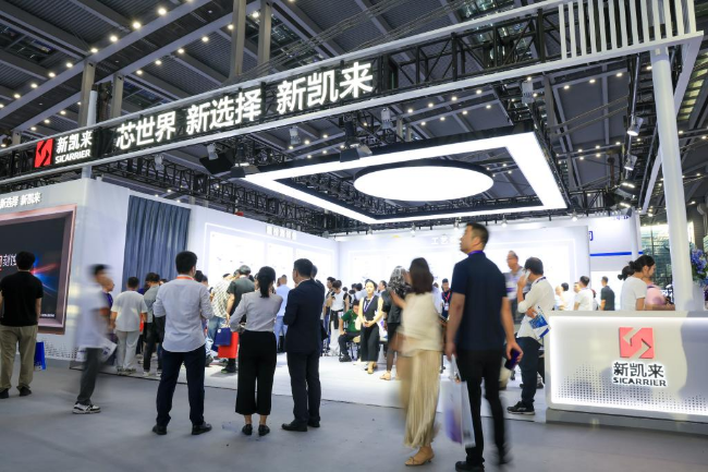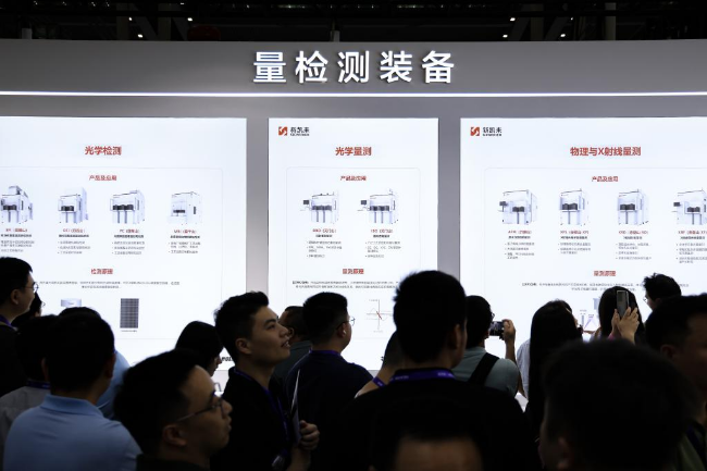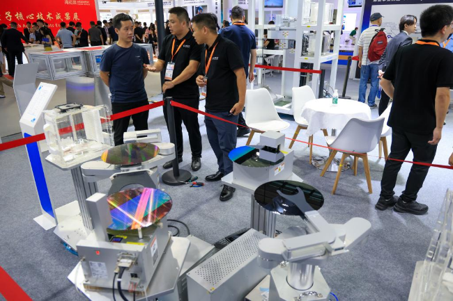 15日、新興の半導体製造装置メーカー新凱来技術(SiCarrier)のブースを見学する来場者。(深圳=新華社記者/毛思倩)