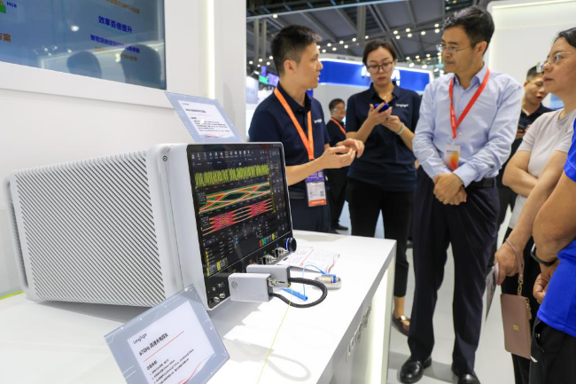 15日、電子計測機器メーカー深圳万里眼技術(LongSight)のブースで新世代超高速リアルタイムオシロスコープを見る来場者。(深圳=新華社記者/毛思倩)