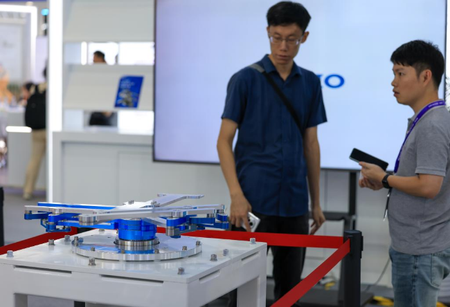 15日、ウエハー搬送ロボットを見る来場者。(深圳=新華社記者/毛思倩)