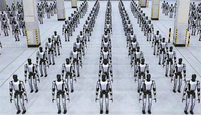 UBTECH’s Walker S2 humanoid robots stand in a grid formation during a large-scale demonstration. Courtesy of UBTECH