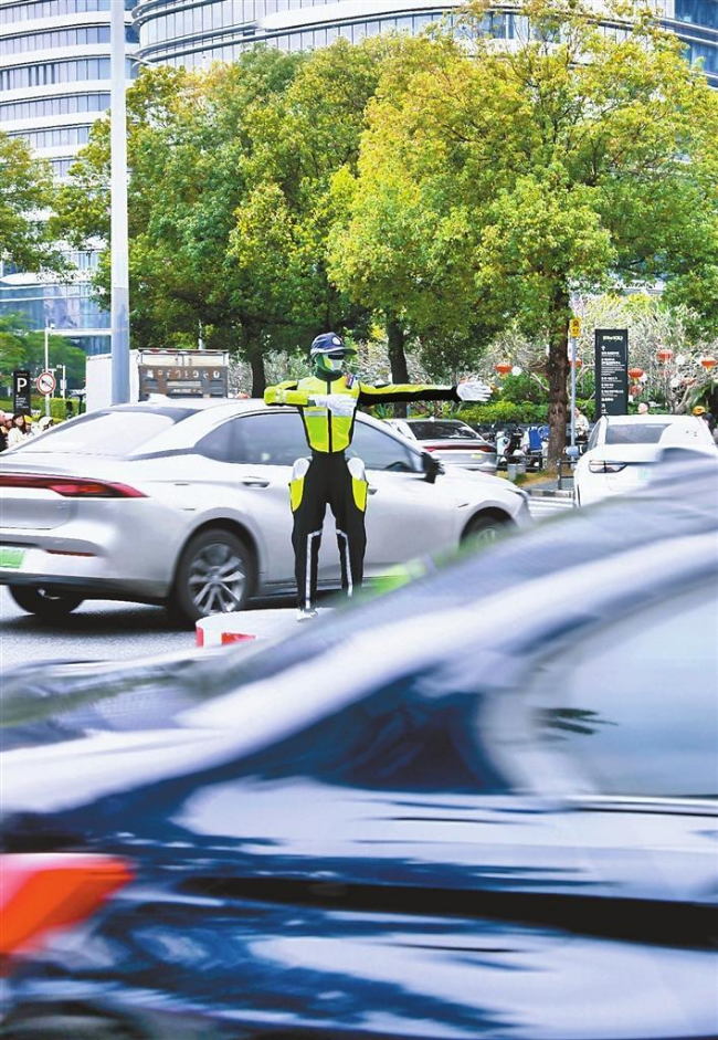 A humanoid robot directs vehicles at the junction of Wuhe Boulevard and Yabao Road in Longgang District. File photo
